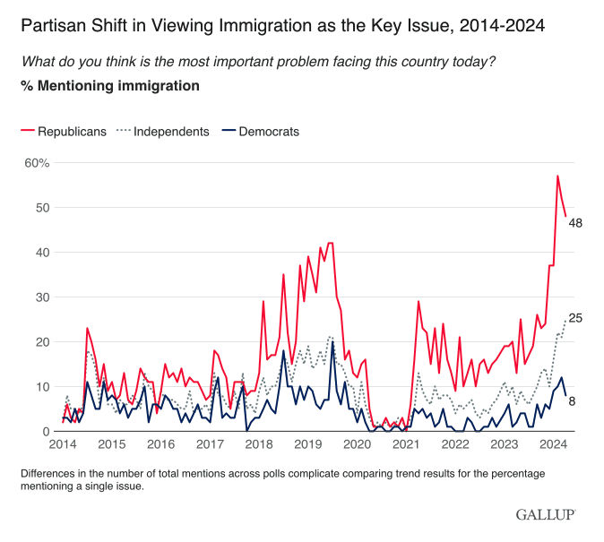 The Data: Immigration is not only a top public concern but also an increasingly partisan issue, with a significant 40-percentage-point gap in concern between Republicans' (48%) and Democrats' (8%) mentions of the issue in April.