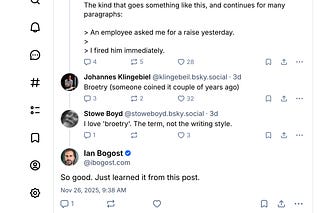 A barrage of single sentence paragraphs culminating in some chest-thumping way.