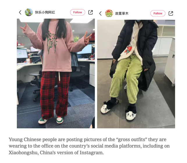 As a follow-on or complement to ‘lying flat’, young Chinese workers are taking to wearing extremely casual wear — ‘gross outfits’ — at work, according to Claire Fu and Daisuke Wakabayashi.
