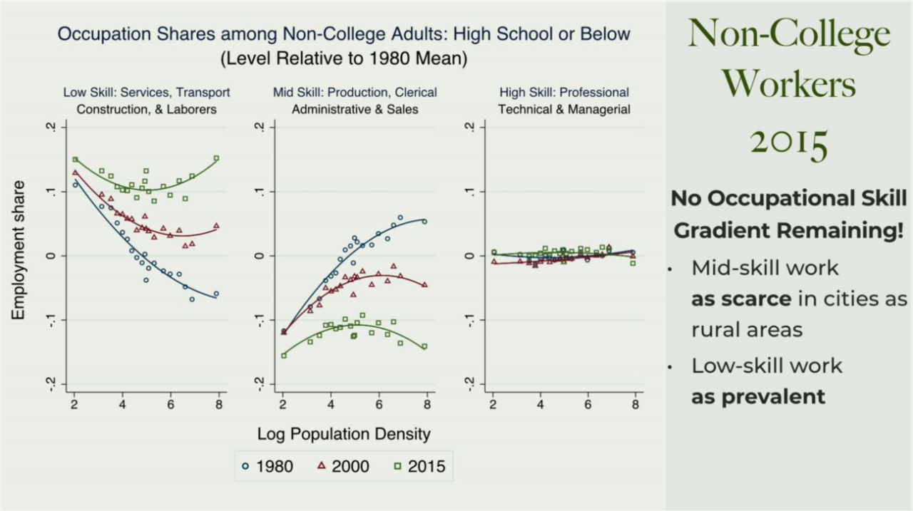 The skinny is that work in the US is increasingly urban, as fewer people are migrating in the country aside from young college-educated people who move to urban areas to become educated, and then don't leave. However, mid-skill work -- which has been historically performed by non-college-educated workers -- has drastically declined, and those workers have been transitioning into low-skilled -- and lower-paid -- work in both urban and non-urban settings. This is the result of automation, computerization, and the impact of manufacturing and clerical work moving offshore.