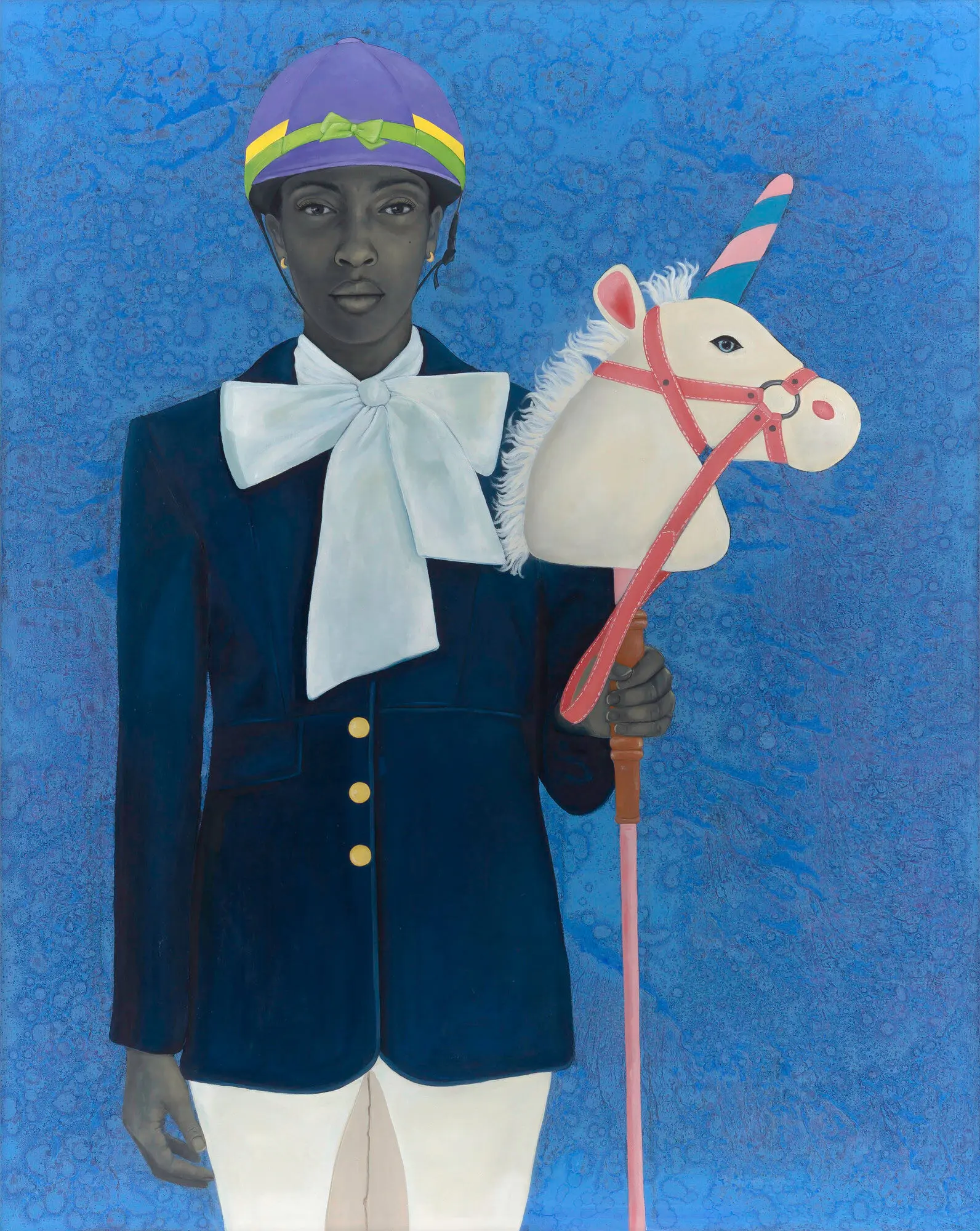 [Sherald’s paintings’] titles add another layer of fictional intrigue. Sometimes taken from novels or poems, they alternately heroicize her figures or gently poke fun at the human capacity for small, foolish, everyday self-deceptions. For instance, “It Made Sense … Mostly in her Mind” (2011), shows a 30-ish woman dressed in a timeless navy blazer with gold buttons. She could be a lawyer until you notice she’s wearing a lavender plastic helmet and holding an old-fashioned toy, a pink-and-white unicorn stick horse. It doesn’t add up, but you can’t say Sherald didn’t warn us: The outfit did make sense … mostly in the subject’s wishful and daydreamy mind.