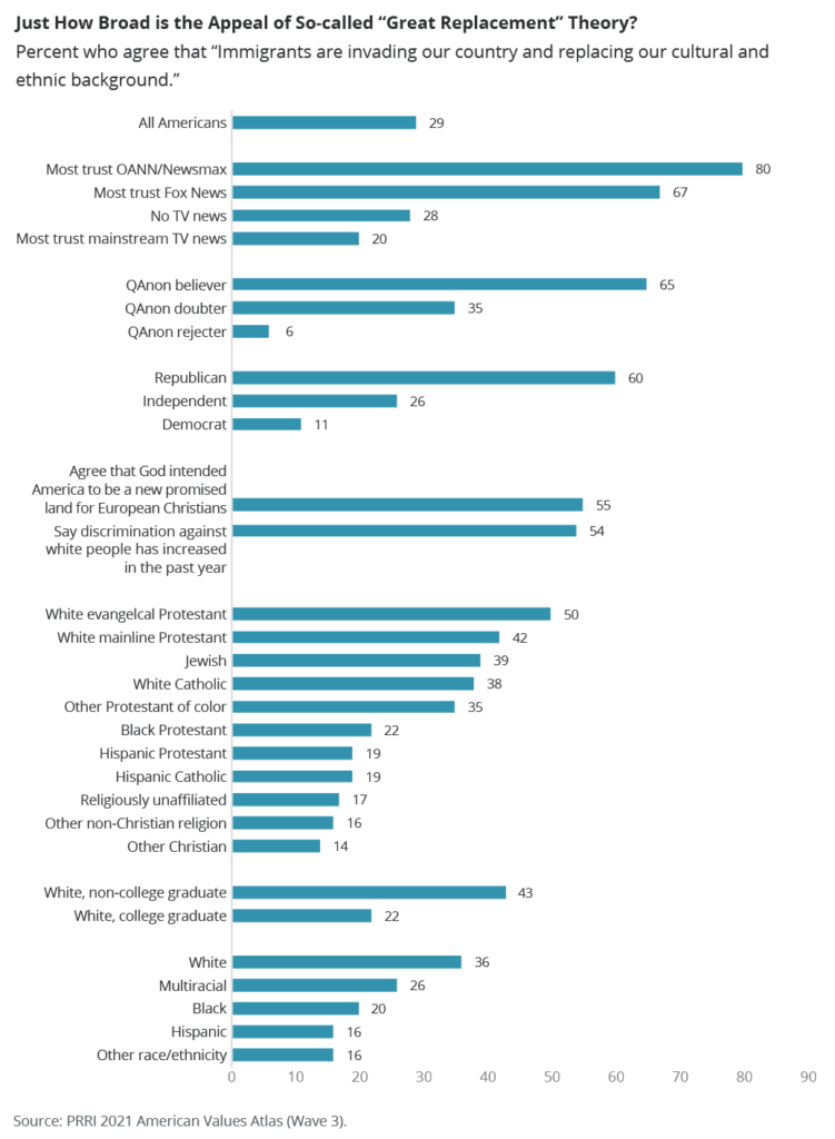 While these ideas have circulated among fringe groups in the past, PRRI data from August 2021 finds that belief in replacement theory is no longer fringe among a range of conservative subgroups. Americans who most trust conservative media outlets like One America News Network or Newsmax (80%) or Fox News (67%) are the most likely subgroups to agree with the statement that, “Immigrants are invading our country and replacing our cultural and ethnic background.” Additionally, 65% of QAnon believers and 60% of Republicans agree with the replacement theory statement, compared to just one in ten Democrats (11%) and one in four independents (26%). Among religious groups, half (50%) of white evangelical Protestants agree with these replacement fears.