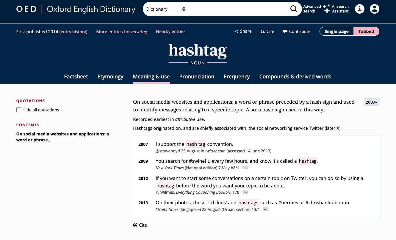 This led me to this screen capture, where I am cited as the source for hashtag. Yes, hashtag. Although they never picked it as word of the year.